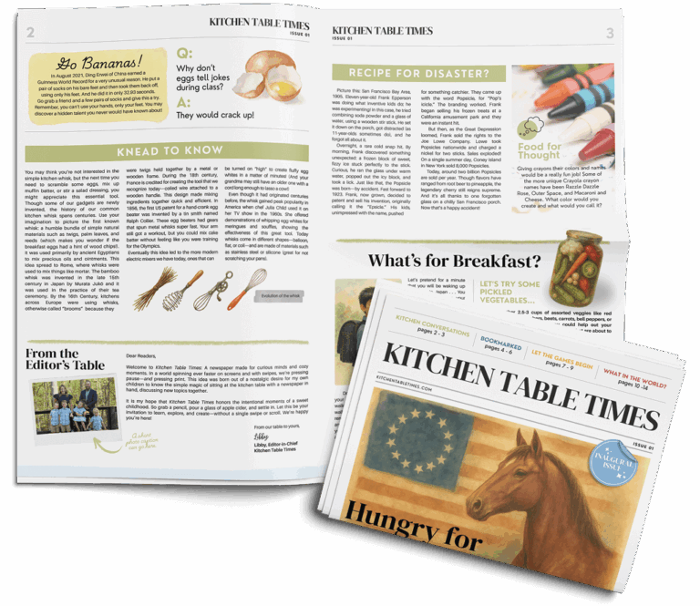 Kitchen Table Times is a monthly, screen-free newspaper for kids ages 6–12, filled with stories, games, and activities that inspire imagination and curiosity. Perfect for families, homeschoolers, and thoughtful gift-givers.